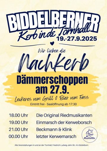 Doch bevor die Kerb verbrannt wird und wieder Ruhe einkehrt, wird an diesem Wochenende nochmal kräftig in der Tornhall die Nachkerb gefeiert. Der Spätschoppen für die ganze Familie am morgigen Samstag beginnt um 18:00 Uhr. Es gibt unter anderem Leckeres vom Grill und Rosmarin-Kartoffeln sowie Bier vom Fass. Der Eintritt ist frei.
