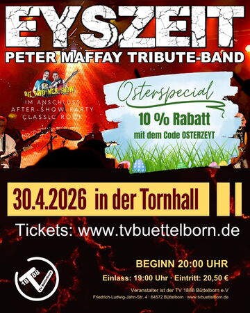 Wir starten noch einmal eine Rabattaktion für den Vorverkauf für das Konzert von EYSZEIT am 30. April 2026. Erlebt einen besonderen Live-Abend mit den größten Hits von Peter Maffay.