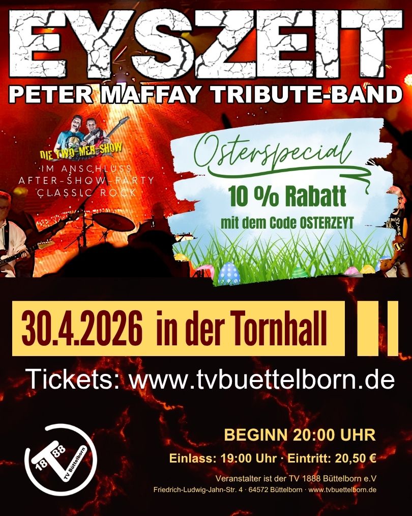 Daher gibt es noch einmal für alle, die den Code TVBEYSZEIT nutzen, 10% Rabatt auf die Ticketpreise. Sichert euch jetzt eure Karten und seid dabei, wenn EYSZEIT die Bühne rockt! Die Aktion läuft noch bis Ostermontag (6. April).