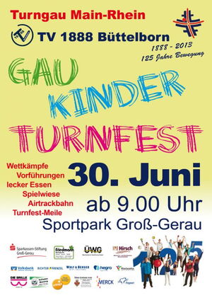 Im Rahmen seiner 125jährigen bestehens richtet der Turnverein 1888 Büttelborn e.V. am Sonntag (30.) das Kinderturnfest des Turngau Main-Rhein aus. Die Veranstaltung findet hauptsächlich im Sportpark Groß-Gerau (Europaring) statt, doch auch in den Hallen der Martin-Buber-Schule und im Freibad werden sportliche Wettkämpfe ausgetragen.