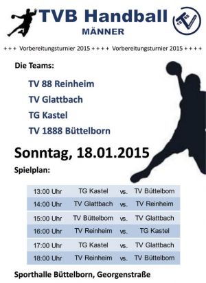 Auch wenn das letzte Spiel unserer Handballmänner in der Bezirksoberliga vor der Winterpause im Lokalderby gegen die HSG WBW unnötig verloren ging, liegt man mit dem 6. Platz voll im Plan. Im neuen Jahr startet der TVB dann gleich mit zwei Heimspielen gegen Erfelden und Arheilgen und die vier Punkte sind fest im Visier, die diesen Rang weiter festigen sollen. Um gut vorbereitet das neue Jahr zu beginnen, veranstaltet der TVB am Sonntag, dem 18.01.2015 ein Turnier. Das Teilnehmerfeld setzt sich mit dem TV Reinheim und dem TV Glattbach aus zwei Vertretern der Landesliga und dem TG Kastel aus der BOL Wiesbaden/Frankfurt zusammen. Gespielt wird im Modus „Jeder gegen Jeden“ mit jeweils 2x20 min Spielzeit. Anpfiff ist um 13:00 Uhr in der Kreissporthalle Büttelborn.