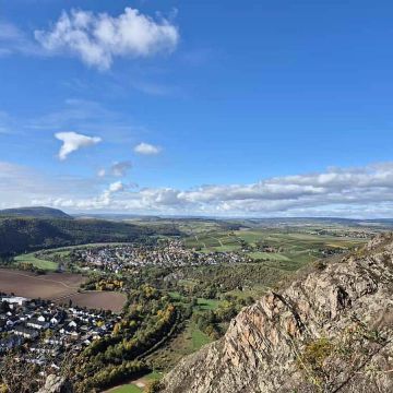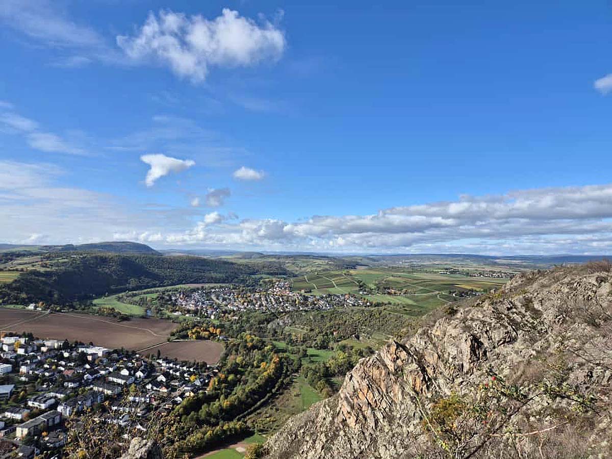 Der Rotenfels erhebt sich mit seiner markanten Steilwand aus rötlich gefärbtem Rhyolith etwa 202 Meter über das Nahetal – insgesamt liegt der Gipfel bei 327 Metern über dem Meeresspiegel. Bereits der Aufstieg bot schöne Ausblicke, die bei strahlendem Sonnenschein und vereinzelten weißen Wolken noch eindrucksvoller wirkten. Nach ein, zwei kurzen Rastpausen erreichten die Wanderer den Aussichtspunkt – und wurden mit einem atemberaubenden Panorama belohnt.