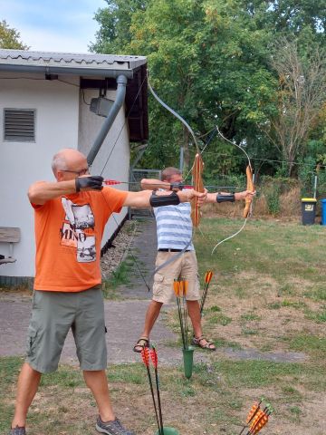"Schießen lernen - Freunde treffen" - nun, bei manchen dauert der immer etwas. Unsere Seniorenturngruppe war auf jeden Fall im Rahmen des Sommerprogramms bei den Hubertus Schützen zu Gast und hat die verschiedenen Übungsgeräte ausprobieren können. Ob Luftgewehr, Luftpistole, Lasergewehr oder mit Pfeil und Bogen - alles war dabei und jeder war irgendwo Spezialist. Dabei hatten die Jungs und Trainerin Dagmar jede Menge Spaß und die berühmten dummen Sprüche sind auch nicht ausgeblieben. Wie auch das Motto "Schießen lernen - Freunde treffen".