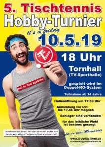 Am kommenden Freitag (10.) findet in der Tornhall das 5. Tischtennis-Hobby-Turnier statt. Um 18 Uhr geht es los. Teilnehmen können alle Hobby-Spieler (auch die Talentfreien) ab 14 Jahren. Die Teilnahme ist kostenlos und die Anmeldung erfolgt ab 17.30 Uhr direkt in der Halle. Schläger werden vom Ausrichter gestellt.