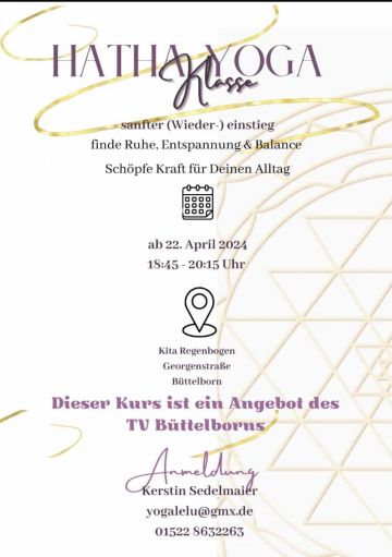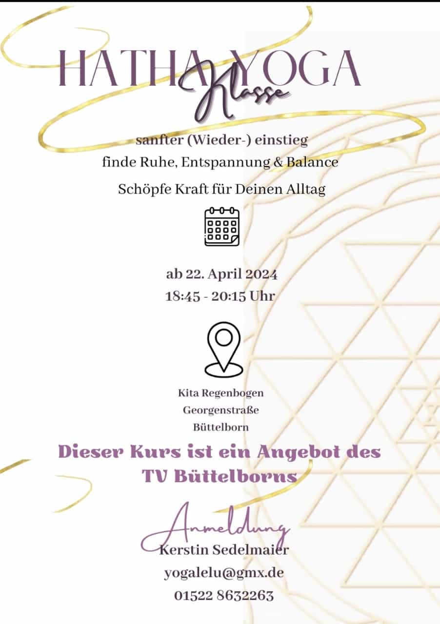 Einen neuen Yoga-Kurs startet der TV Büttelborn mit Trainerin Kerstin Sedelmaier am Montag (22) in der Kita-Regenbogen. Weitere Infos gibt es bei Kerstin per E-Mail: yogalelu@gmx.de