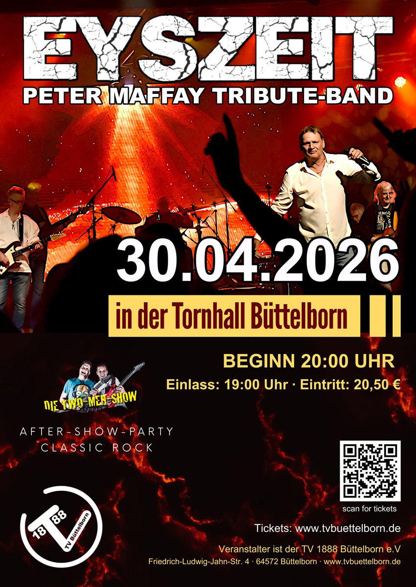 Noch bis zum 6.12.2025 gibt es 10% Rabatt für Tickets für das Konzert der Peter-Maffay-Tribute-Band "EYSZEIT" mit Leadsänger Reiner Vogl am 30.04.2026 in der Tornhall. Die Aktion haben wir verlängert, da es in den letzten Tagen zu Störungen der Homepage gekommen ist.