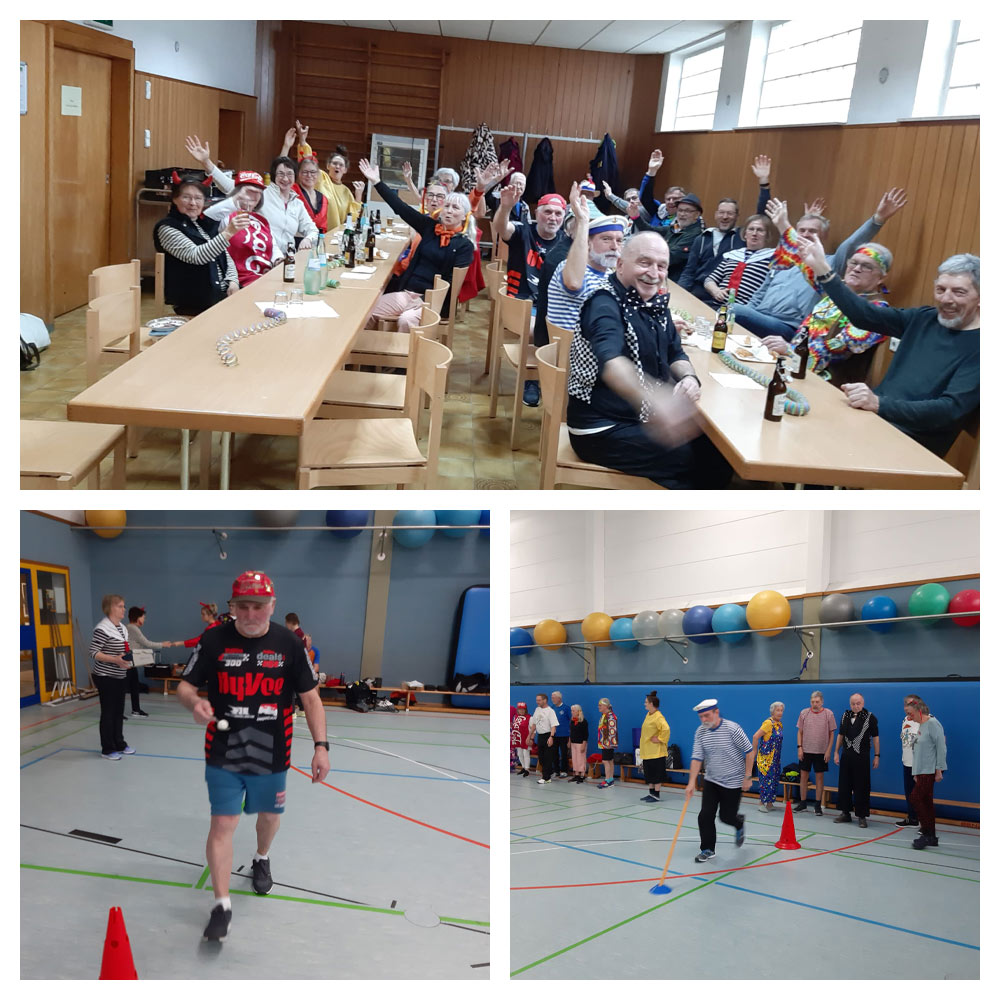 Unsere beiden Seniorensportgruppen „Herbstfeuer“ und die „Golden Girls“ haben in der Fastnachtswoche gemeinsam und stimmungsvoll Sport gemacht. Mit kleinen und vor allem lustigen Spielen wurde die Übungsstunde zusammen verbracht. Dabei gab es viel zum Lachen. Anschließend gab es im Gymnastikraum in der Tornhall nochmal Stimmung bei Weck, Worscht, Sekt und Bier.
