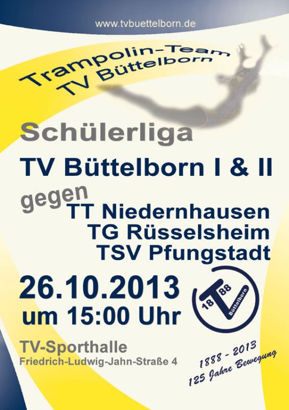 Am Samstag (26.) sind unsere beiden Nachwuchsmannschaften in heimischer TV-Halle in der Schülerliga gefordert. Gegner sind der TT Niedernhausen, die TG Rüsselsheim sowie der TSV Pfungstadt. Der Wettkampf beginnt um 15 Uhr und dauert ca. zweieinhalb Stunden.