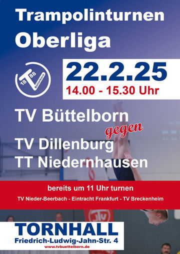 Die Trampoliner vom TV Büttelborn haben am Samstag um 14:00 Uhr zwei Topfavoriten der Oberliga zu Gast. Mit dem TV Dillenburg und dem TT Niedernhaussen trifft der TVB auf zwei starke, mit Kaderathleten gespickte Teams. Auch wenn unsere Riege als Außenseiter auf die Geräte geht, wollen die Büttelborner ähnlich wie vor zwei Wochen in Ranstadt alles geben.