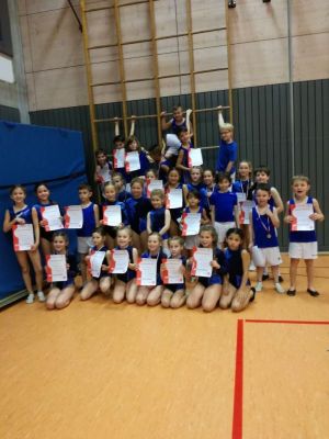 Die Kinder hatten in ihren Riegen jeder vier Wettkampfgeräte zu absolvieren, die sie die Wochen vorher im Training geübt hatten. Hier turnte jeder einzelne je nach Altersstufe und Schwierigkeit eine eigene Übung. Als die Kinder dies gemeistert hatten, neigte sich der Tag dem Ende zu. Und zum Schluss des Wettkampfes gab es natürlich die Siegerehrung. Hier spiegelte sich wieder, wie toll und konzentriert die Kinder geturnt haben und was für tolle Leistungen sie erbracht haben. Mit neun Podestplätzen konnte der TVB ein sehr gutes Ergebnis erzielen. Bei den jüngste Jungs zeigten vor allem Max Senßfelder und Oliver Derdau (1. und 2.) dass sie in den Übungsstunden fleißig trainiert haben. Abu-Reza Nabizada schaffte es auf den dritten Rang, ebenso wie Clara Seif.