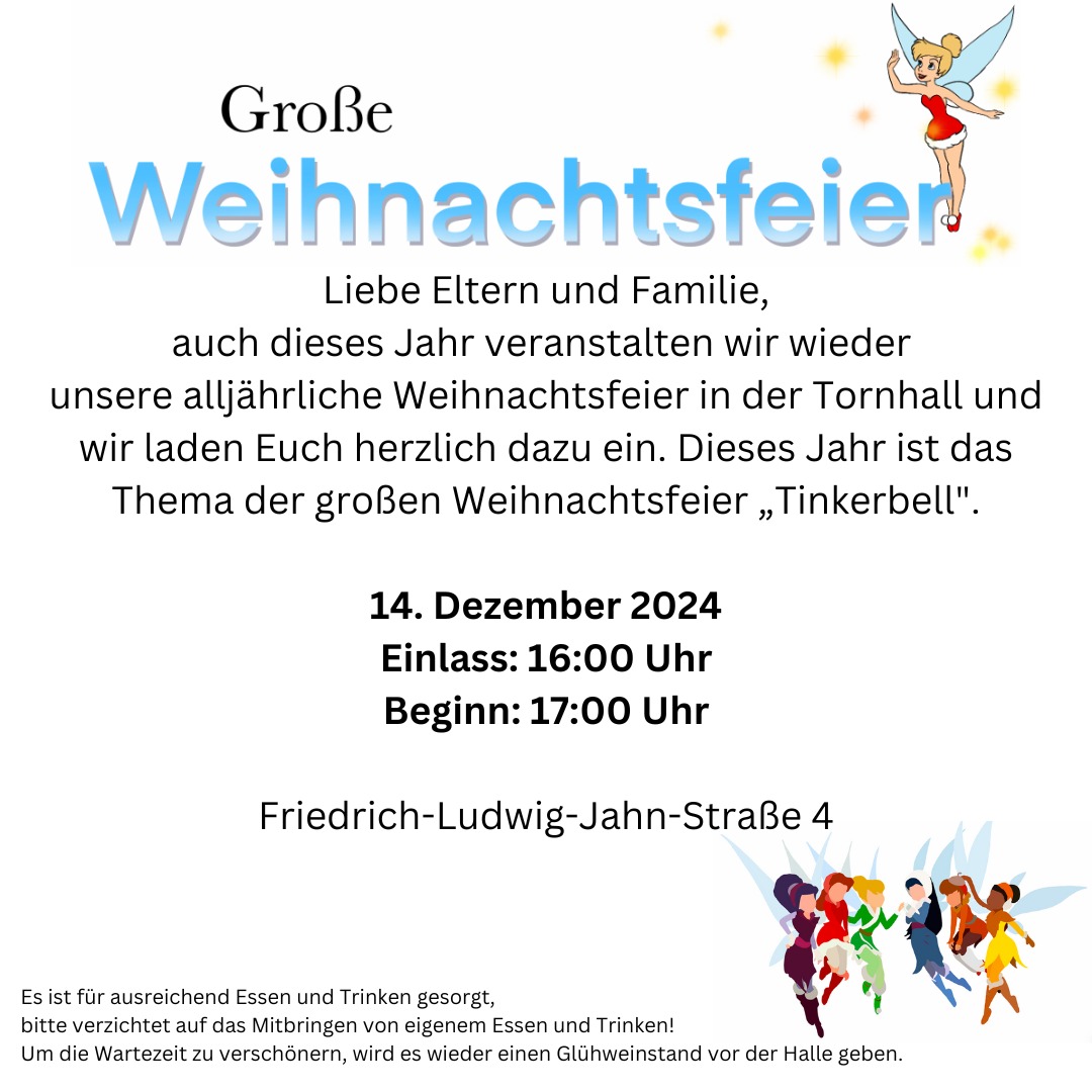 Am Samstagnachmittag geht es dann mit unseren größeren Kids und Jugendlichen weiter. Einlass ist um 16 Uhr, Beginn um 17 Uhr. Damit euch die Wartezeit verschönert wird, gibt es auch dieses Jahr einen Glühweinstand vor der Halle. Ganz unter dem Motto „Tinkerbell“ werden 11 Gruppen mit euch gemeinsam in die Welt der Feen eintauchen.