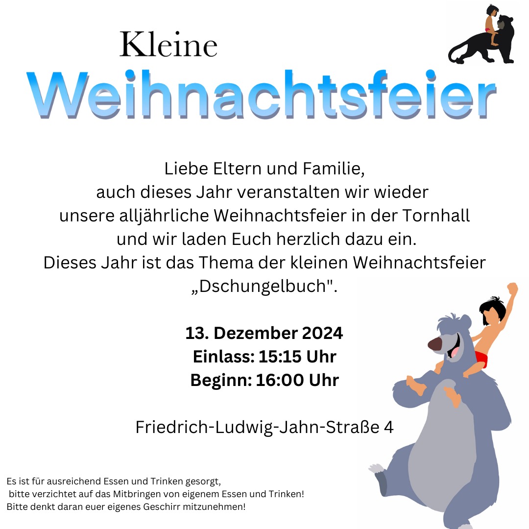 Am Freitagnachmittag, den 13.12., findet die kleine Weihnachtsfeier des TV Büttelborn statt. Einlass ist um 15:15 Uhr, Beginn um 16 Uhr. Hier werden euch die jüngsten des TV’s mit Hilfe von Mogli und Balu in ein unglaubliches Abenteuer in den Dschungel entführen.