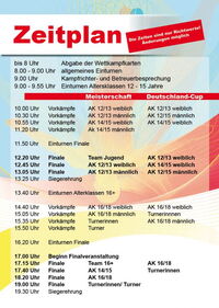Der Zeitplan für die Deutschen Meisterschaften wurde nun veröffentlich. Die Wettkämpfe beginnen bereits um 10 Uhr, die ersten Jugendfinals sind für 12.20 Uhr angesetzt. Jetzt wissen wir auch, wann die Büttelborner Springer ungefähr ihre Vorkämpfe haben: