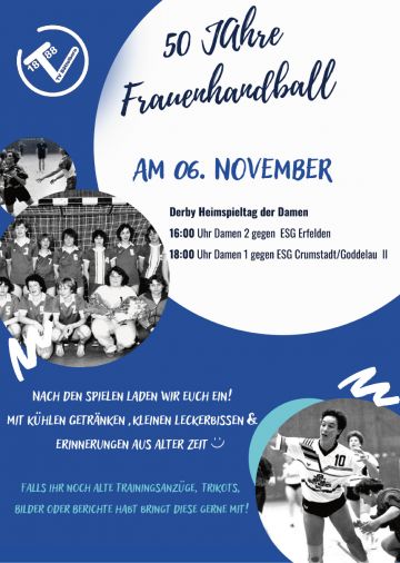 Am 3. März 1972 wurde an der Jahreshauptversammlung des TV Büttelborn der Gründung einer Frauen-Handballmannschaft zugestimmt. 50 Jahre ist das nun her und das ist allemal ein Grund zum Feiern. Unsere Handballmädels laden daher an ihrem "Heimspiel-Derby-Tag" am 6. November ab 16 Uhr in die Sporthalle ein. Zunächst spielen die Frauen II gegen die ESG Erfelden und um 18 Uhr die "Erst" gegen die ESG Crumstadt/Goddelau. Kühle Getränke, kleine Leckerbissen und Erinnerungen an die alte Zeit sind Euch versprochen.