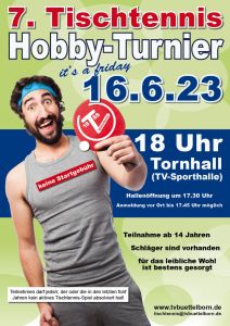 Zum siebten Mal lädt der TVB zum Hobby-Turnier in die Tornhall bzw. TV-Sporthalle ein. 18 Uhr geht es los, Hallenöffnung ist um 17.30 Uhr. Mitmachen kann jede/r ab 14 Jahren, der/die in den letzten Jahren kein aktives Tischtennisspiel absolviert hat. Eine Teilnahmegebühr wird nicht erhoben, die Anmeldung erfolgt direkt in der Halle. Schläger sind ausreichend vorhanden, wer will, darf natürlich seinen eigenen Schläger (also Tischtennis-Schläger, nicht irgendwelche Hooligans) mitbringen. Für das leibliche Wohl ist gesorgt.