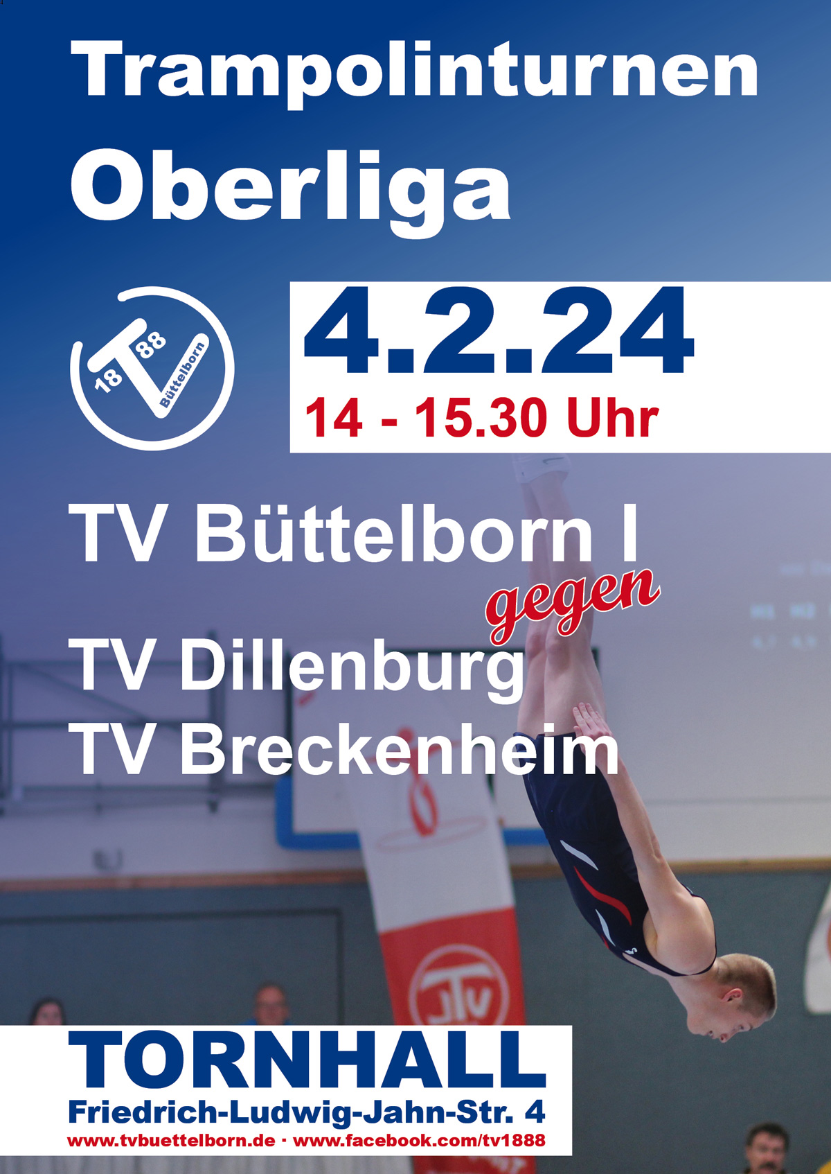 Der TVB turnt am ersten Wettkampftag der Trampolin-Oberliga gegen den TV Dillenburg und den TV Breckenheim. Los geht es um 14 Uhr, für Verpflegung und hochklassigen Trampolinsport ist bestens gesorgt. Der Eintritt ist frei.
