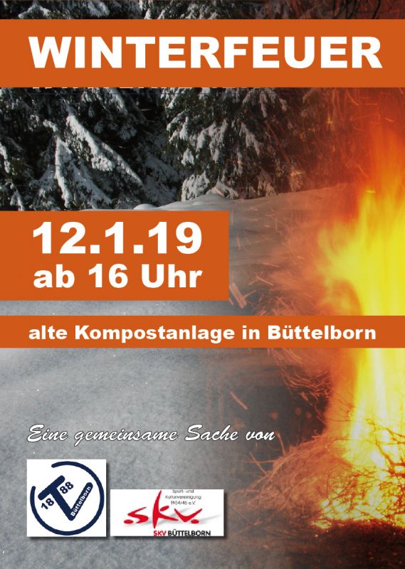 Gemeinsame Sache machen TV 1888 Büttelborn e.V. und SKV Büttelborn 1904/46 e.V. wieder. Denn das alljährliche Winterfeuer organisieren die beiden Großvereine seit vielen Jahren gemeinsam. Die Veranstaltung beginnt am Samstag, dem 12. Januar an der alten Kompostanlage um 16 Uhr, etwa eine Stunde später wird das Feuer entfacht. Für Verpflegung und warme Getränke ist wie immer ausreichend gesorgt.