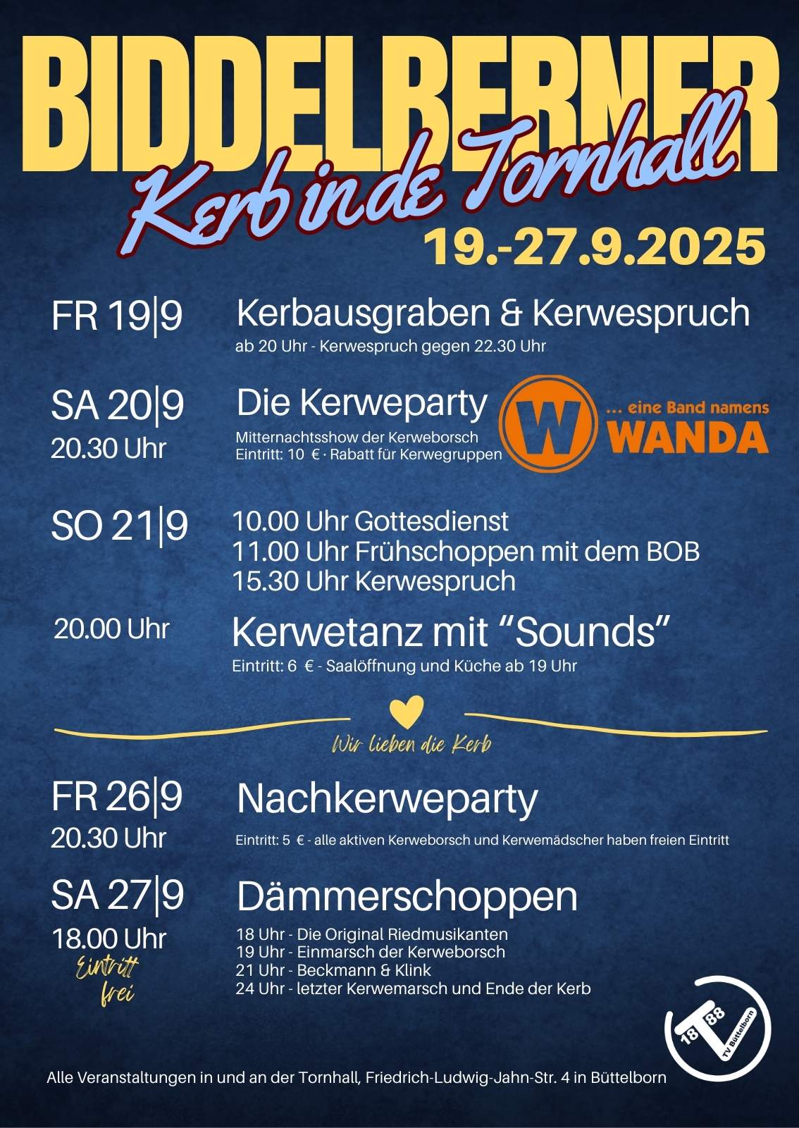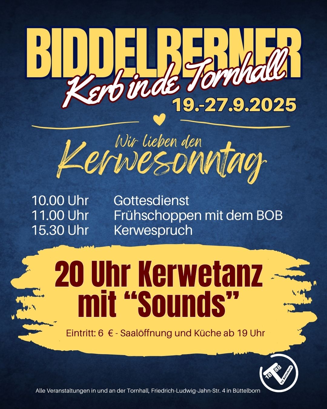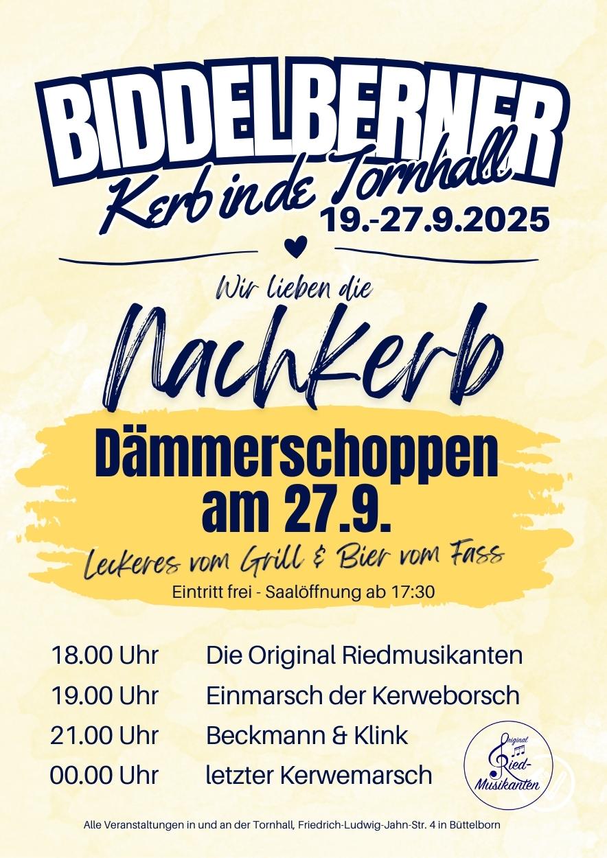 Vom 19 .- 27. September 2025 wird wieder die gut' alt' Biddelberner Kerb in de Tornhall gefeiert. Der TV Büttelborn, die Kerweborsch und die Kerwemädscher freuen sich über Ihren Besuch.