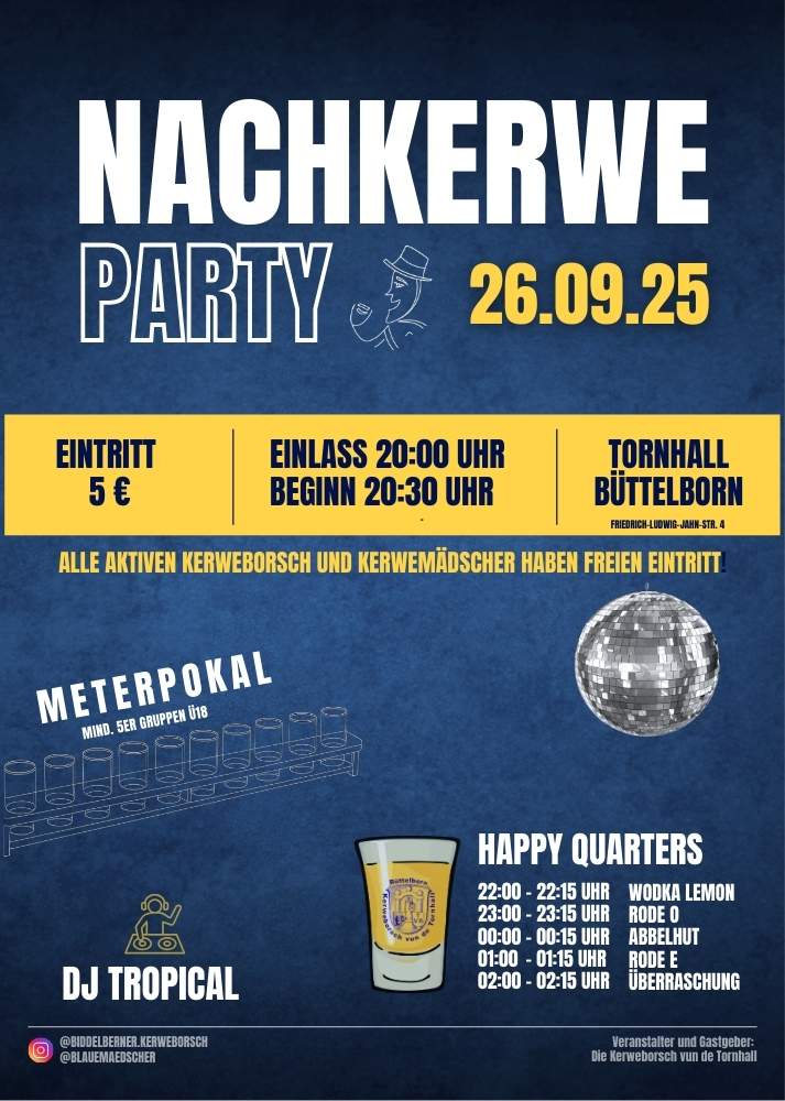 Willkommen auf der Seite der Kerweborsch vun de Tornhall aus Büttelborn. Hier findet Ihr alle Informationen rund um die Kerweborsch, die Kerwemädscher und die gut' alt' Biddelberner Kerb in de Tornhall. Wir wünschen Euch viel Spaß beim Stöbern!