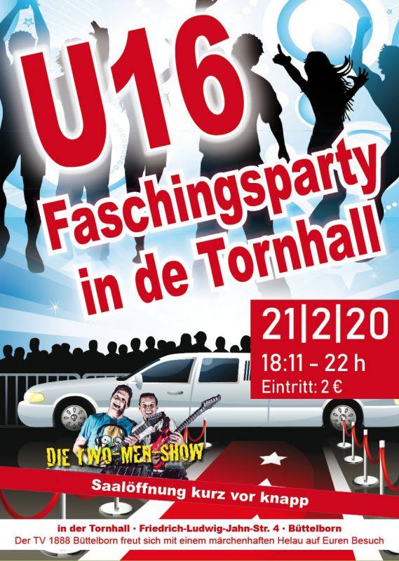 Die Faschingsparty der Gymastikfrauen vor einer Woche war bereits ein voller Erfolg. In drei Wochen geht es in der Tornhall weiter. Am 21. Februar findet wieder die U16-Party statt, los geht es um 18.11 Uhr. Wir werden dieses Mal den Saal etwas verkleinern, damit von Anfang an beste Stimmung aufkommt. Samstags gibt es dann die große Motto-Party (Wenn Euch nix einfällt zum Thema - egal. Hauptsache, Ihr kommt verkleidet...) und am Rosenmontag ist wie immer die Kinderfastnacht. Und natürlich sind an allen drei Tagen unsere Haus- und Hof-DJs von der Two-Men-Show dabeil